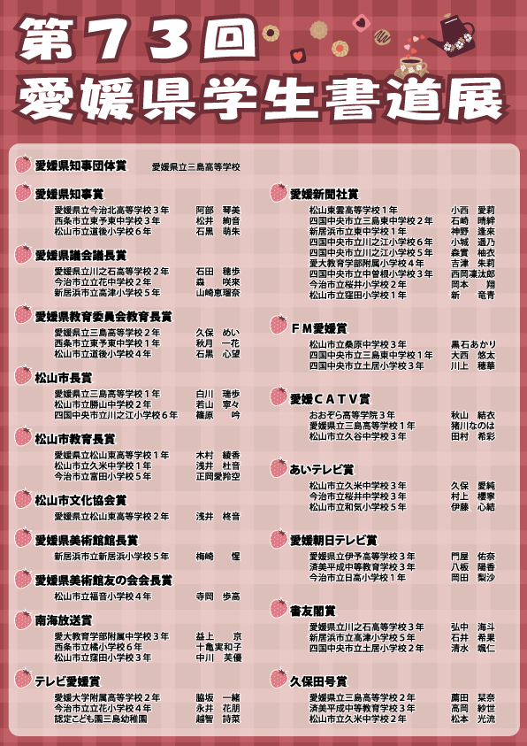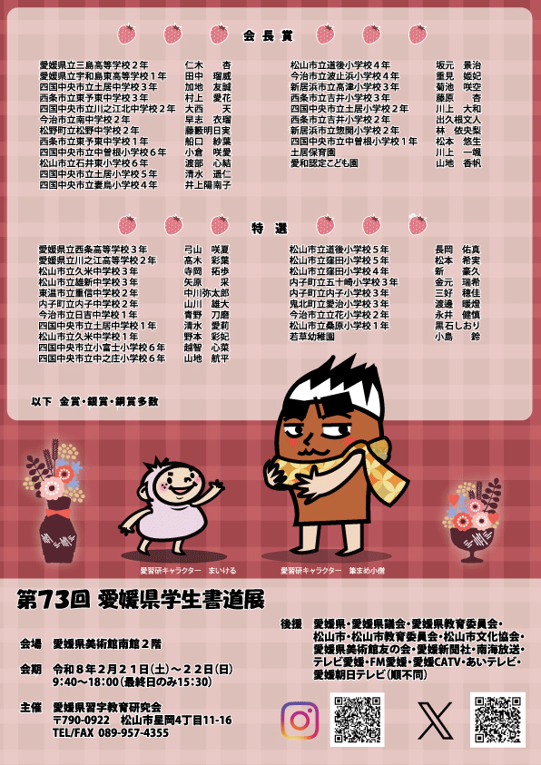 投稿日: 2026年2月28日2026年2月28日 投稿者: fudemame【学生書道展】第73回愛媛県学生書道展審査結果※クリックすると大きくなります。第73回愛媛県学生書道展の審査結果です!受賞されたみなさま、本当におめでとうございます!ここには特選以上の賞の方の名前しかありませんが、出品して下さった全ての作品を展示しております。共有: X で共有 (新しいウィンドウで開きます) X 友達にメールでリンクを送信 (新しいウィンドウで開きます) メールアドレス Facebook で共有 (新しいウィンドウで開きます) Facebook Pinterest で共有 (新しいウィンドウで開きます) Pinterest WhatsApp で共有 (新しいウィンドウで開きます) WhatsApp Threads で共有 (新しいウィンドウで開きます) Threads 印刷 (新しいウィンドウで開きます) 印刷 いいね:いいね 読み込み中…